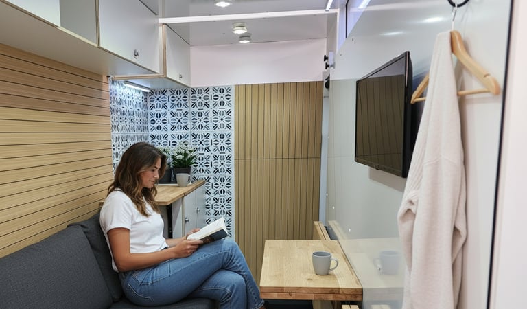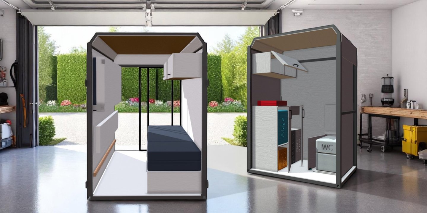 Moduł kuchenny z dostępem do wody, lodówki, gniazdek i oświetlenia i toalety.