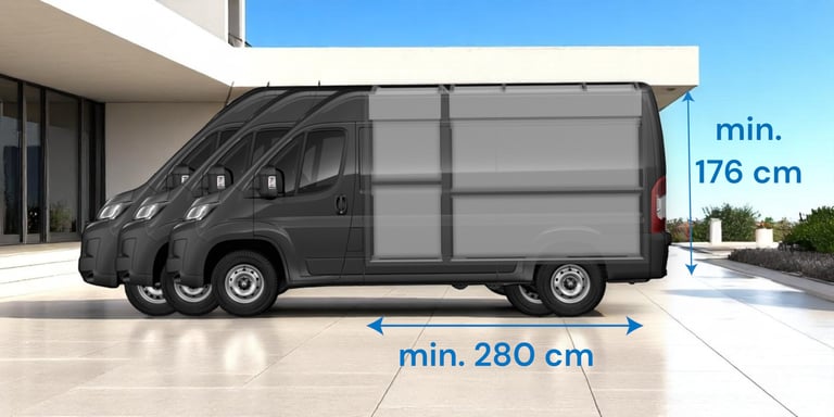 Wymagany Van L2H2 lub większy, o wymiarach załadunku: 175 cm drzwi i 280 cm długość.
